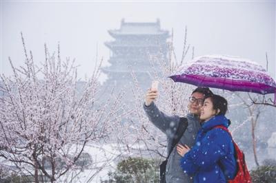 阴晴雨雪关系百姓生活,因此广受关注。图为日前山西省晋中市平遥县迎来降雪天气,游客在古城门外合影留念。梁生仁摄(发)