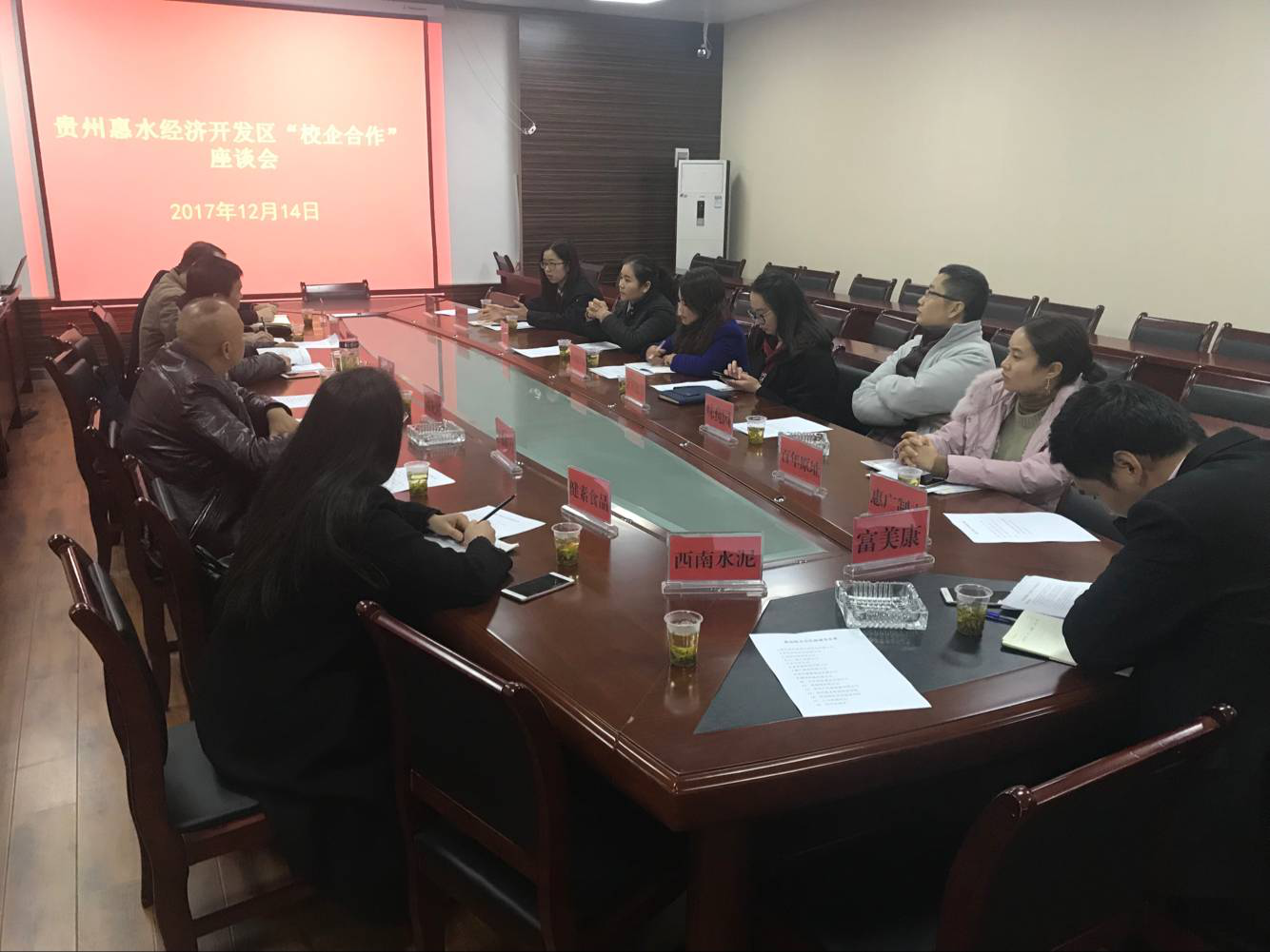 2017年12月中旬,贵州财经大学商务学院与惠水县人民政府濛江街道办事处合作共建行政管理专业实践教学基地举行签约仪式。经开区人力资源中心主任谢廷斌及经开区其他领导、惠水县人力资源中心相关负责人、贵州省十余家企业代表、贵州财经大学商务学院管理系岑燕坤主任和教师代表一同参加了本次校企合作座谈会。