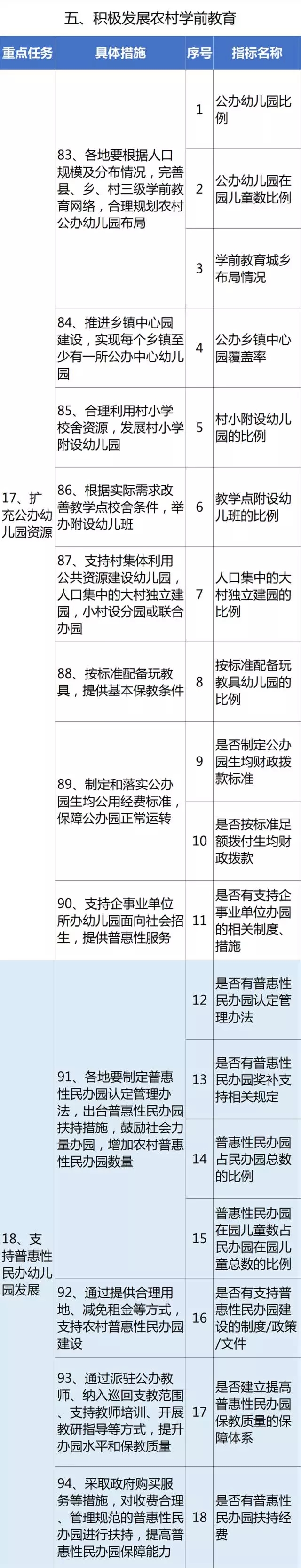 五是积极发展农村学前教育,包括扩充公办幼儿园资源,支持普惠性民办幼儿园发展,补充学前教育师资队伍,改革学前教育管理体制等。