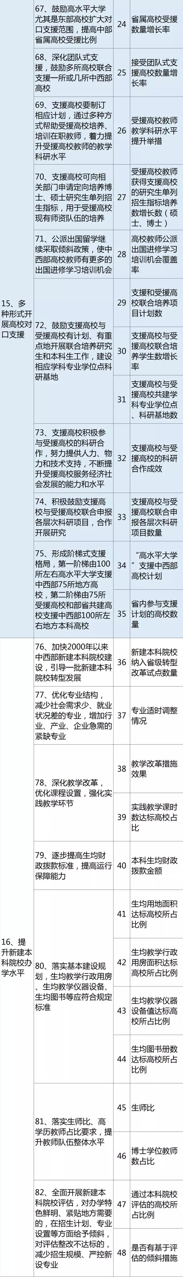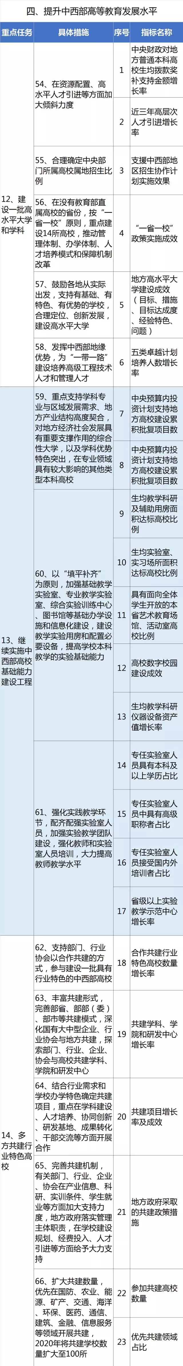 四是提升中西部高等教育发展水平,包括建设一批高水平大学和学科,继续实施中西部高校基础能力建设工程,多方共建行业特色高校,多种形式开展高校对口支援,提升新建本科院校办学水平等。