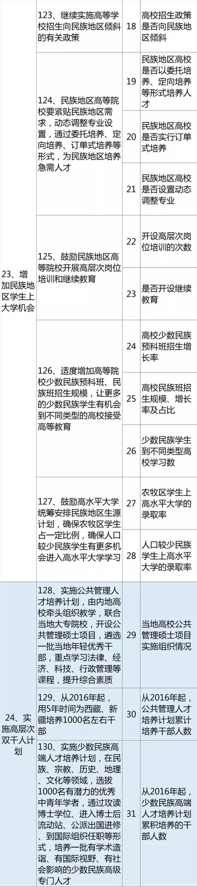六是推动民族教育加快发展,包括办好内地西藏班、新疆班,实施万名教师支教计划,增加民族地区学生上大学机会,实施高层次双千人计划等。