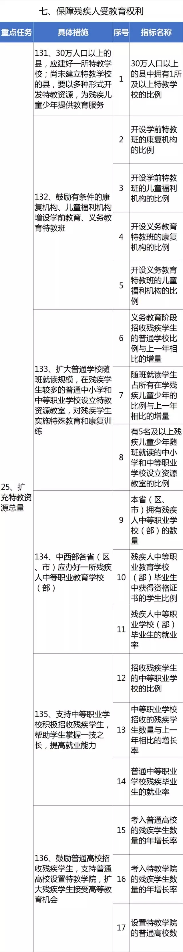七是保障残疾人受教育权利,包括扩充特教资源总量,加强特教教师队伍建设,拓展特教服务模式,提高特教经费保障水平等。
