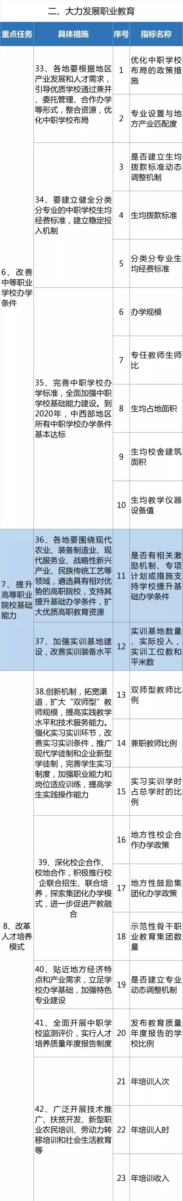二是大力发展职业教育,包括改善中等职业学校办学条件,提升高等职业院校基础能力,改革人才培养模式等。