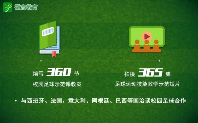 ? ? 大力培养培训校园足球师资,引进国外足球强国的教材、教师和教练,拍摄360节足球课教学视频并在全国推广,在所有校园足球特色学校全面实现校园足球教学标准化,以校园足球教育教学改革带动学校体育改革发展。