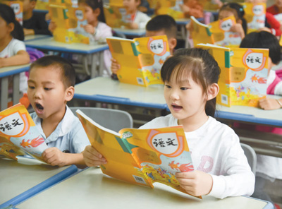 2017年8月31日,安徽合肥少儿艺术学校一年级学生在开学预备课上熟悉新编语文教材。(新华社记者 张端/摄)
